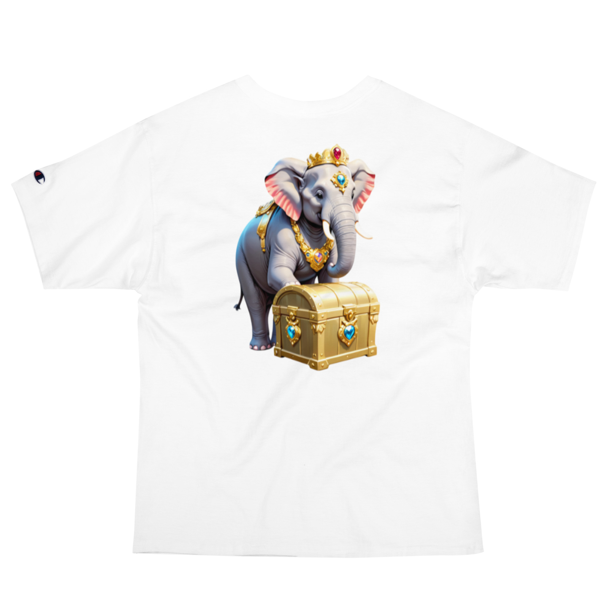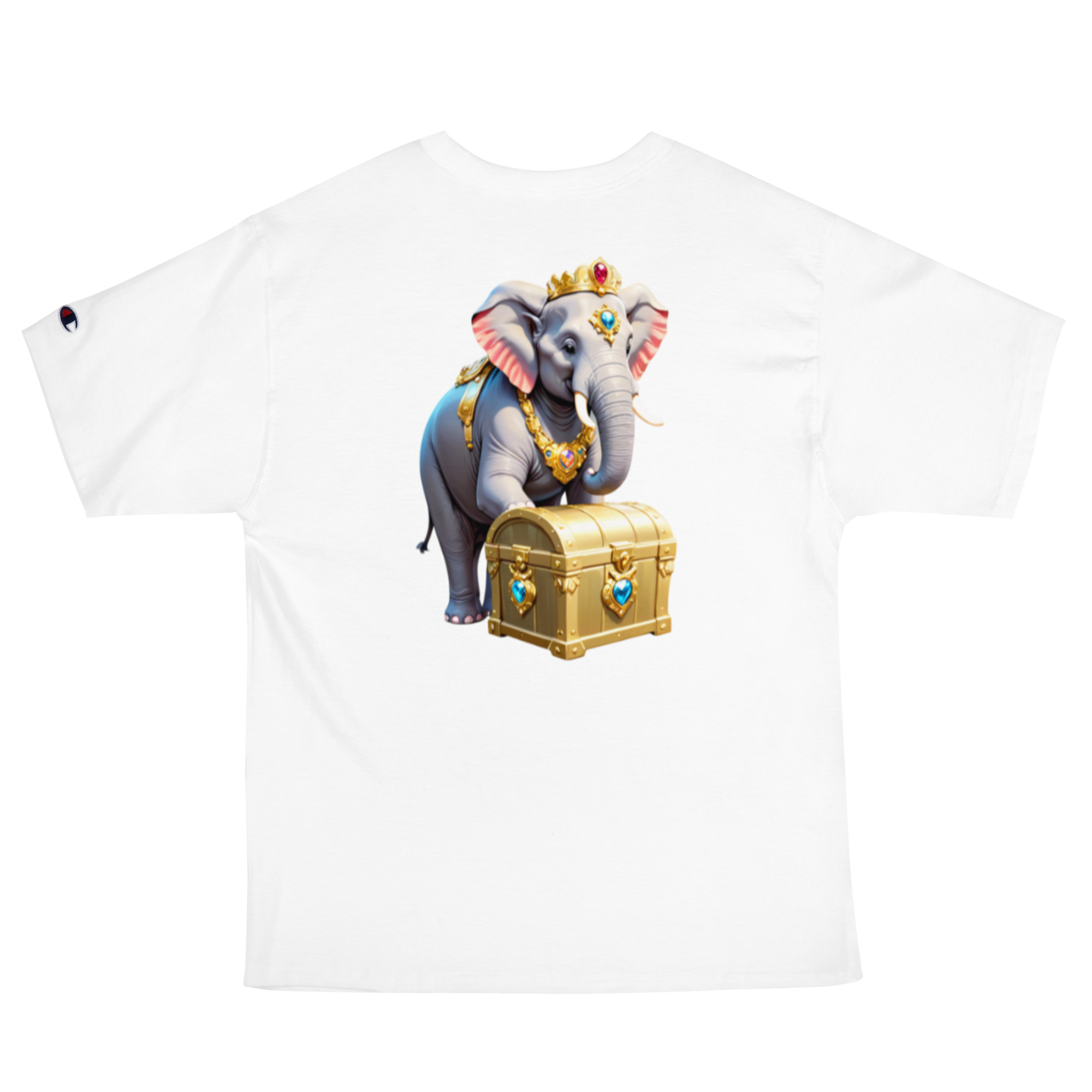 Enrich your wardrobe with this elegant Golden Treasure Trunk elephant design on a Champion t-shirt that has the brand logo embroidered on the left sleeve. The 100% cotton fabric and deep armholes are sure to make it your favorite tee.