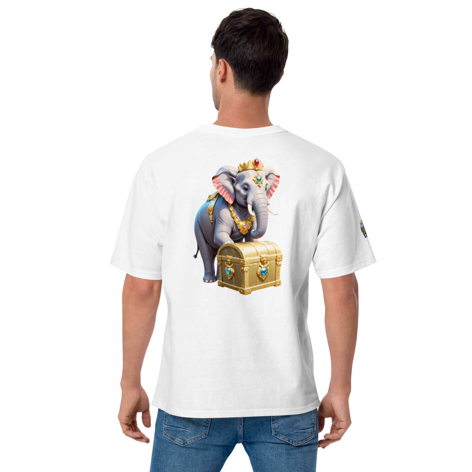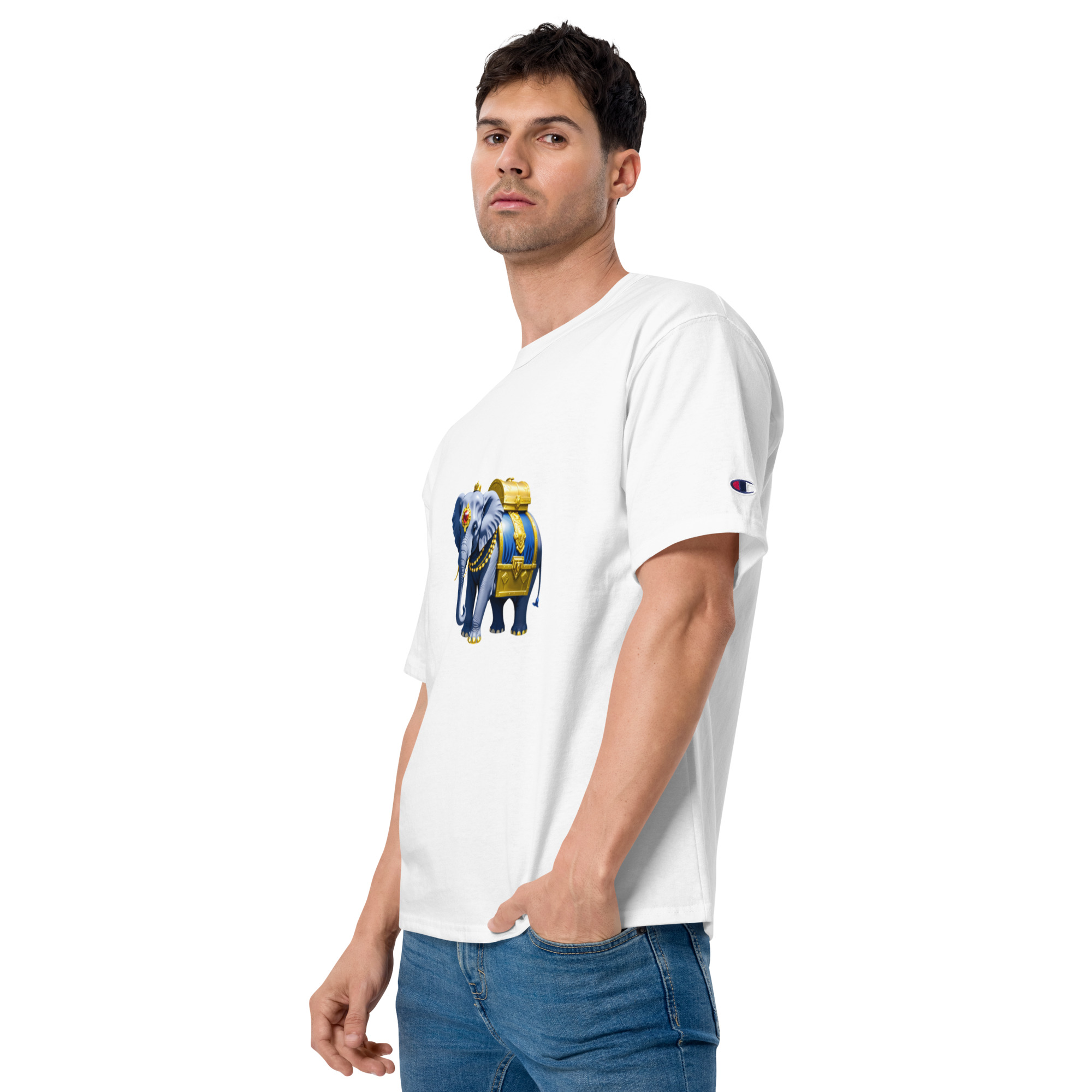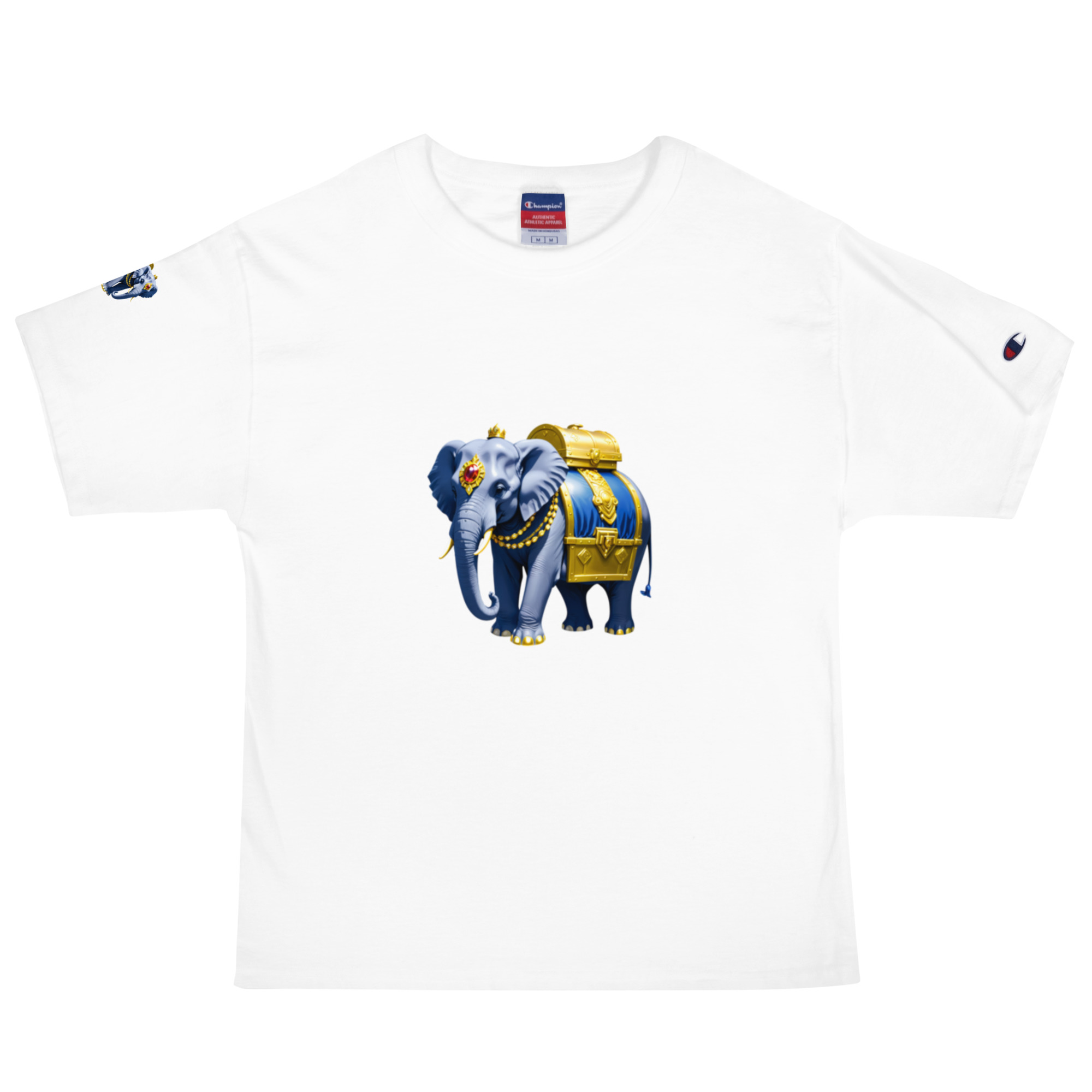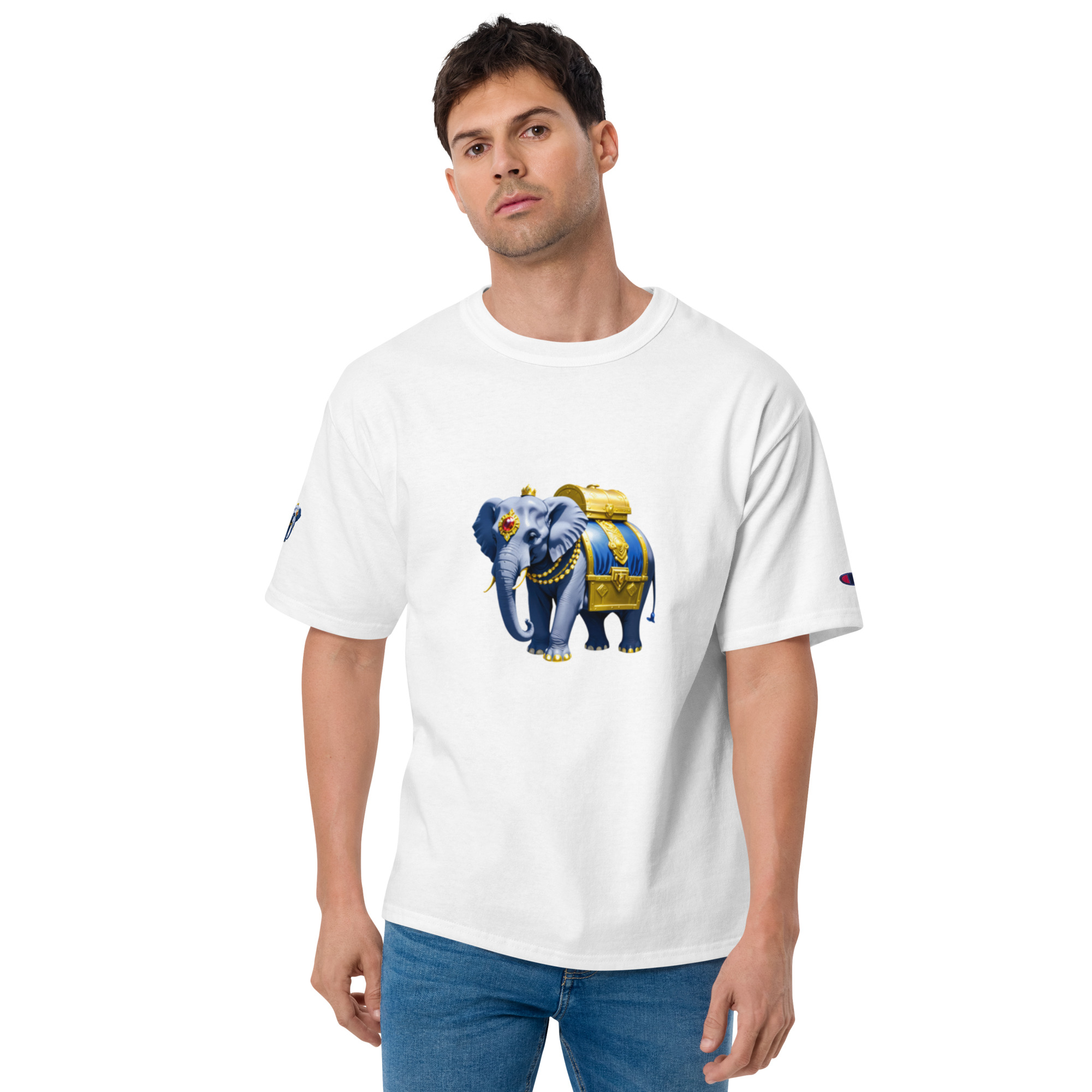 Enrich your wardrobe with this elegant Golden Treasure Trunk elephant design Champion t-shirt that has the brand logo embroidered on the left sleeve. The 100% cotton fabric and deep armholes are sure to make it your favorite tee.